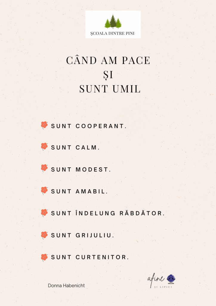 Luna aceasta ne oprim la valorile Pace și Umilință. D. Habenicht le asociază, „pacea începe cu umilința, un cuvânt pe care majoritatea oamenilor nu vor să-l audă în zilele noastre.” Pacea începe în inimile și casele noastre.